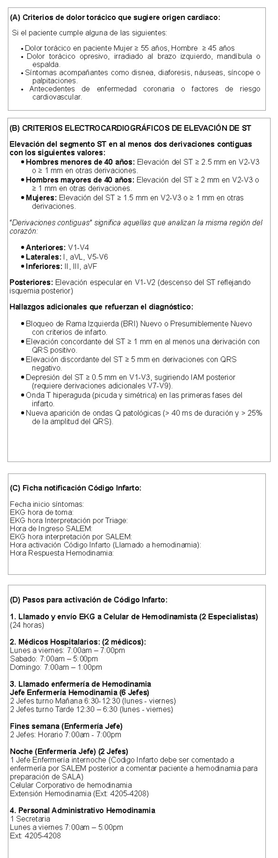 Esta Herramienta de Estandarización Clínica (HEC´s) fundamentado en la mejor evidencia disponible, tiene como objetivo desarrollar una Vía Clínica Rápida para estandarizar el diagnóstico y manejo integral del infarto agudo de miocardio con elevación del ST (IAMCEST) de la Red Hospitalaria Méderi (RHM). Esta herramienta fue liderada y validada por el equipo de Gestión y Estandarización de la Práctica Clínica, el Instituto Méderi de Corazón y Tórax, junto al servicio de clínicas médicas y urgencias de la RHM. Las recomendaciones están dirigidas al equipo multidisciplinario del código infarto, incluyendo médicos urgenciólogos, cardiólogos, hemodinamistas, enfermeros de urgencias y hemodinamia, técnicos radiólogos, químicos farmacéuticos (para dispensación inmediata de fármacos) y personal de transporte de emergencias. Cubre todas las fases críticas: triage prioritario, evaluación clínica electrocardiográfica (ECG en <10 min), activación inmediata del protocolo de reperfusión (PCI primaria o fibrinólisis), administración de terapia farmacológica precoz (antiagregantes plaquetarios, anticoagulantes, analgesia), manejo de complicaciones (arritmias, shock cardiogénico) y traslado seguro a hemodinamia. Adicionalmente, servirá como herramienta educativa para estudiantes de pregrado/posgrado, así como para gestores hospitalarios responsables de optimizar flujos clínicos y recursos estratégico. Quedan explícitamente excluidos los pacientes pediátricos y aquellos con IAM sin elevación de ST (IAMSEST) o dolor torácico no coronario. Su implementación busca reducir el tiempo puerta-balón (≤90 min), disminuir la mortalidad intrahospitalaria y prevenir complicaciones.