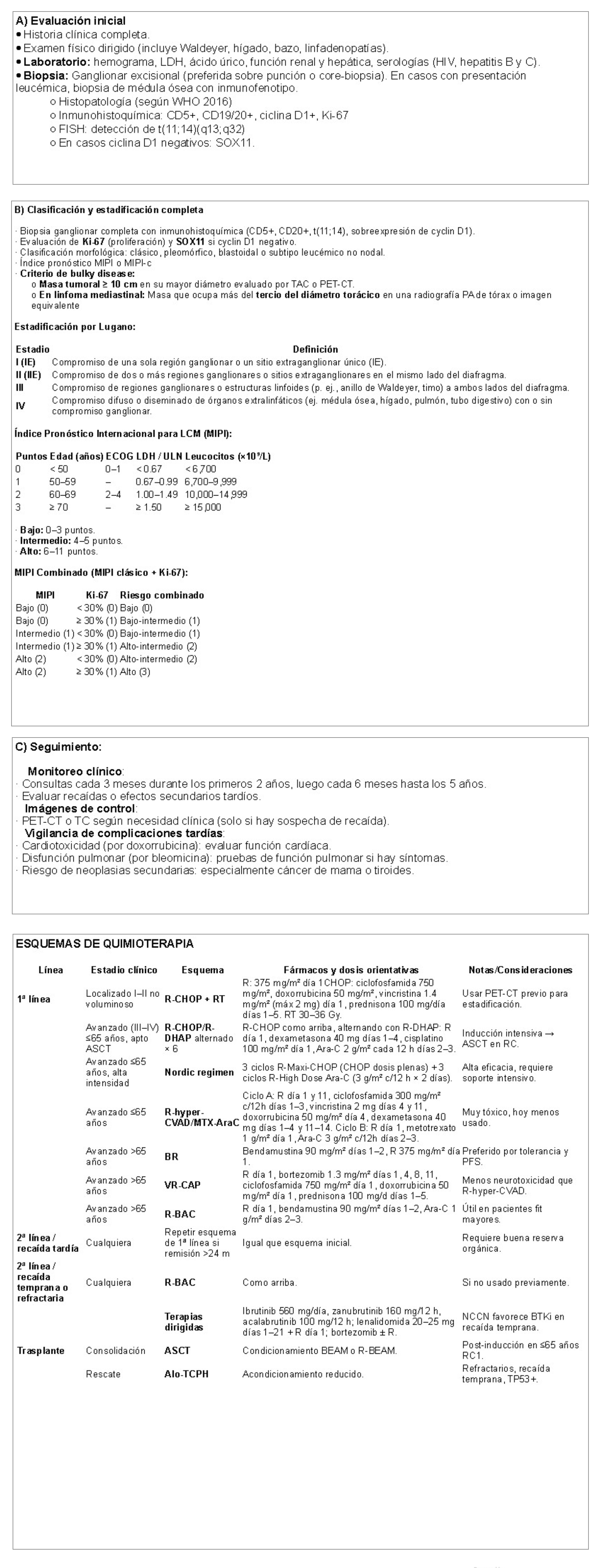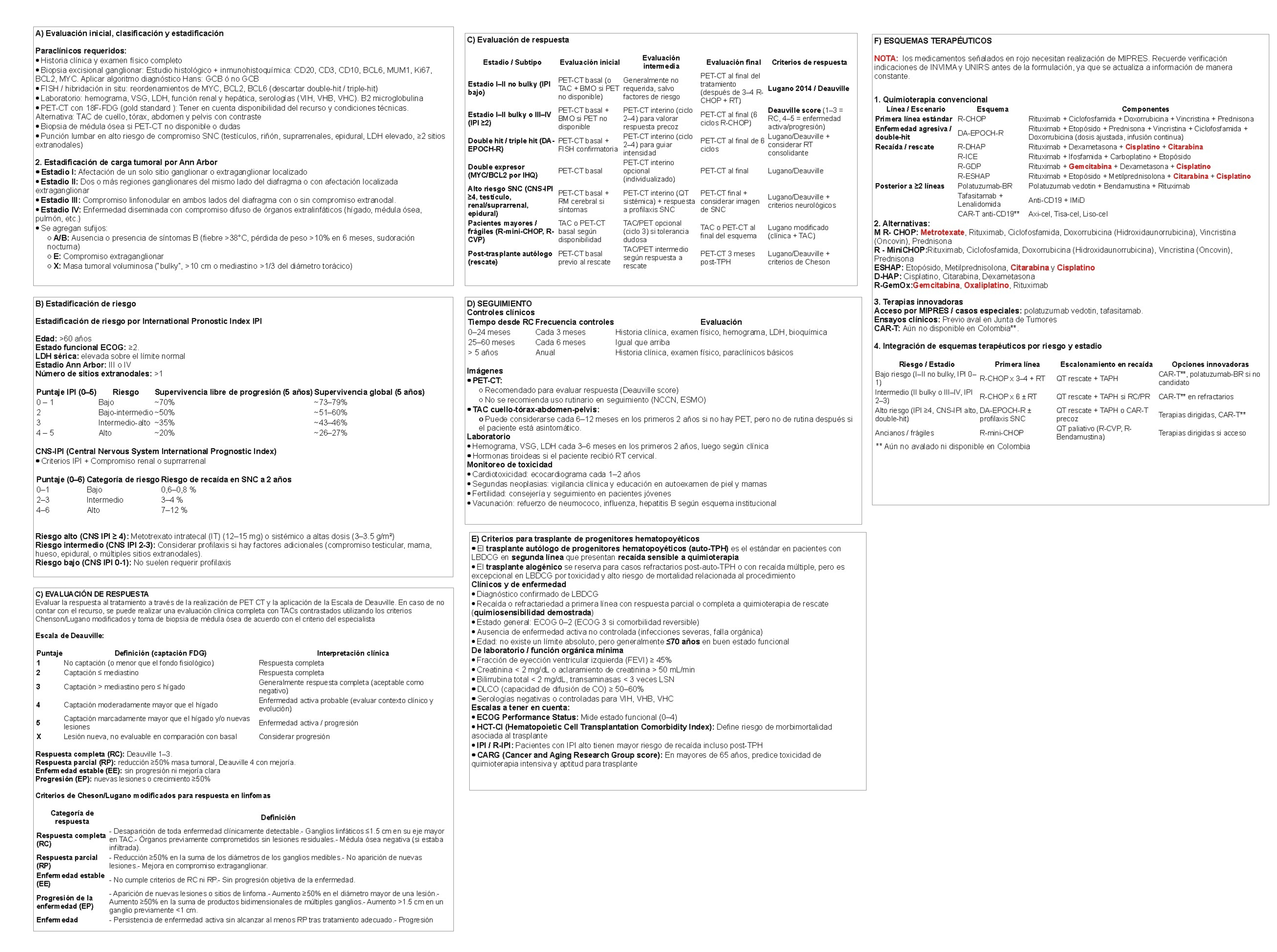 Esta Herramienta de Estandarización Clínica, busca elaborar un algoritmo clínico estandarizado para el diagnóstico y tratamiento de linfoma Hodgkin y no Hodgkin de la Red Hospitalaria Méderi (RHM), con base en la mejor evidencia disponible. Esta HEC fue liderada y validada por la Instituto Méderi de Cáncer, el equipo de Gestión y Estandarización de la Práctica Clínica. Las recomendaciones están dirigidas al equipo oncológico especializado, incluyendo hematólogos-oncólogos, radiólogos, patólogos (para inmunohistoquímica y subclasificación), médicos nucleares, médicos generales, enfermeros oncológicos, químicos farmacéuticos (para quimioterapia e inmunoterapia), bioeticistas y psicólogos (para soporte emocional). Cubre todas las fases: sospecha diagnóstica (evaluación de adenopatías, síntomas B), biopsia excisional guiada por imagen, estudios de estadificación), estratificación por riesgo (según criterios IPS para LH o IPI para LNH), selección de esquemas de tratamiento, respuesta terapéutica (criterios de Lugano), manejo de complicaciones (infecciones, toxicidad cardiopulmonar) y seguimiento a largo plazo (detección de recaídas o segundas neoplasias). Adicionalmente, servirá como herramienta educativa para estudiantes de pregrado/posgrado, así como para gestores hospitalarios responsables de garantizar acceso a terapias de alto costo y estudios moleculares. Quedan explícitamente excluidos los pacientes pediátricos (<18 años, por protocolos pediátricos específicos), gestantes (manejo en conjunto con obstetricia de alto riesgo) y linfomas asociados a VIH sin control inmunovirológico (requieren abordaje especializado). Su implementación busca reducir la variabilidad en el manejo, asegurar la oportunidad en el inicio del tratamiento (<21 días desde diagnóstico) y alinearse con las guías de la Sociedad Europea de Oncología Médica (ESMO) y el la normatividad Colombiana.