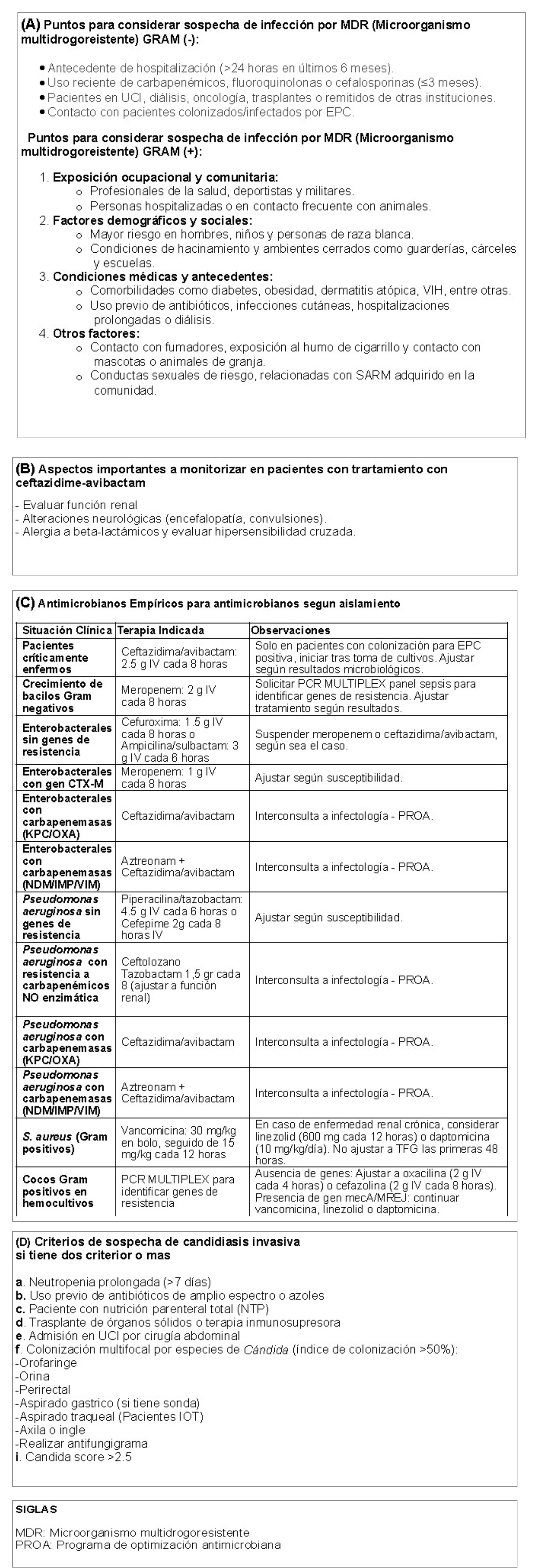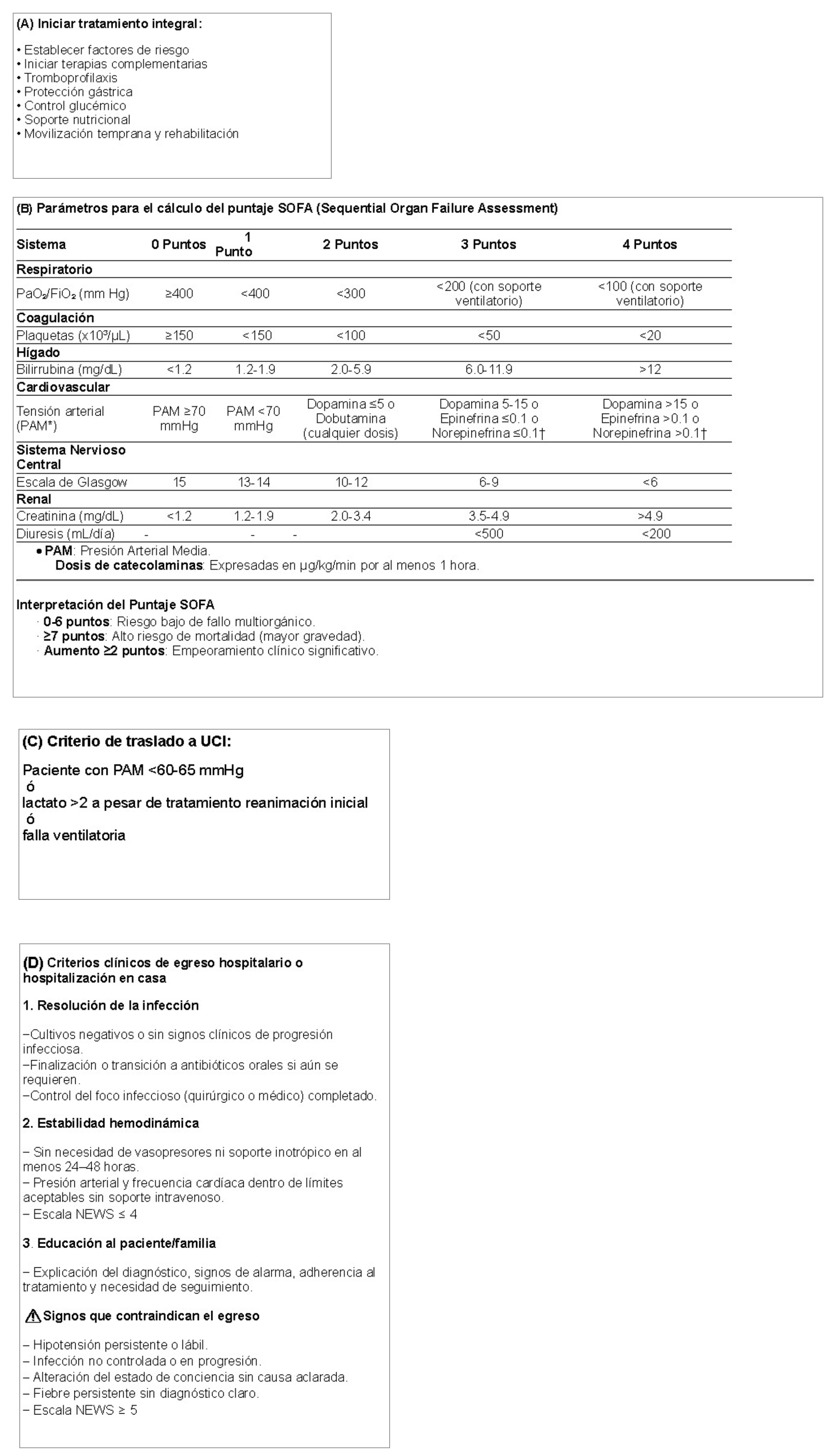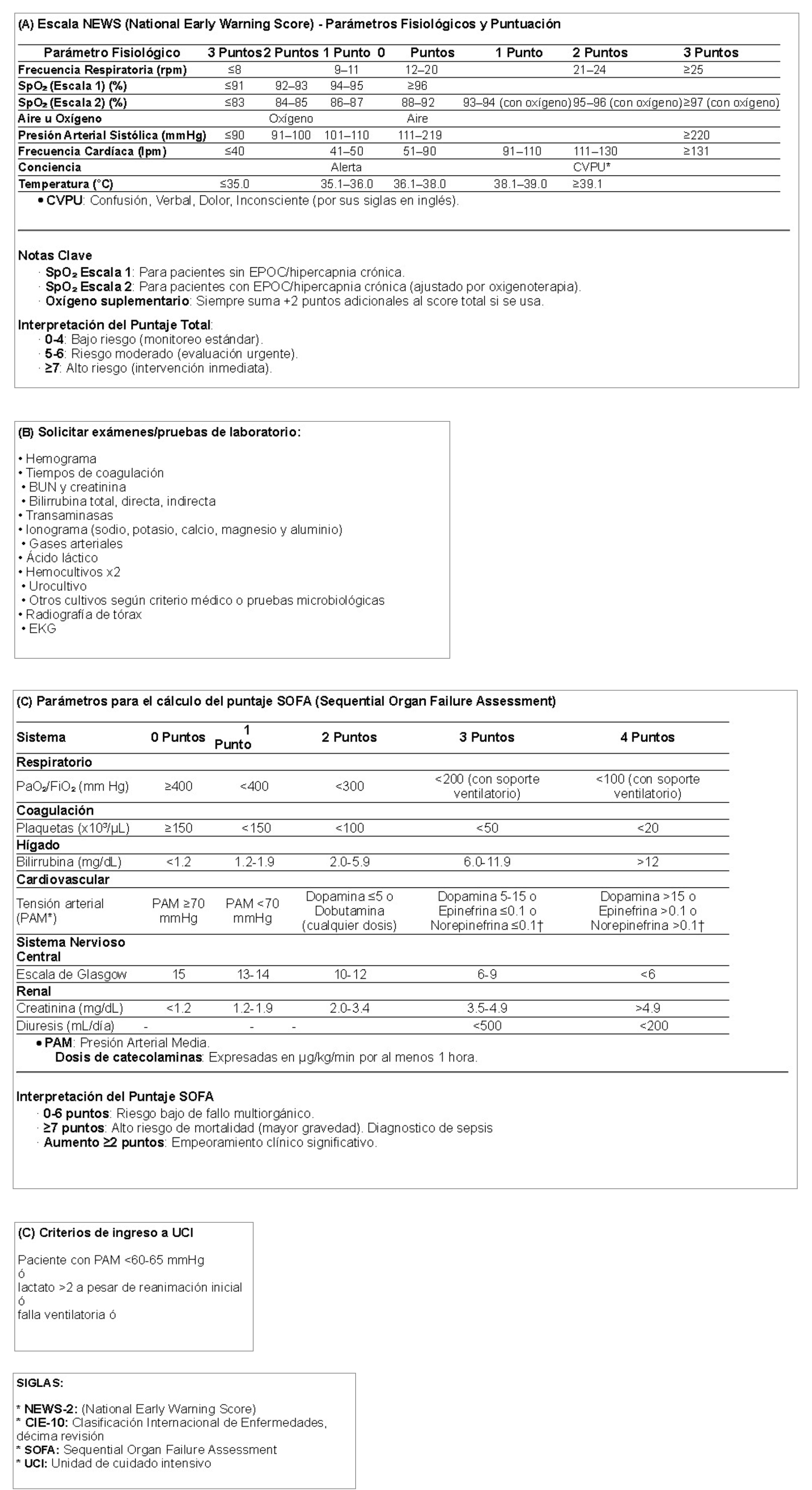 Esta Herramienta de Estandarización Clínica (HEC´s) fundamentado en la mejor evidencia disponible, tiene como objetivo desarrollar un algoritmo clínico estandarizado para el diagnóstico oportuno, tratamiento inicial, monitoreo y tratamiento antimicrobiano del paciente adulto con sepsis o choque séptico atendido en los servicios de urgencias, hospitalización y cuidado crítico de la Red Hospitalaria Méderi (RHM). Esta herramienta fue liderada y validada por el equipo de Gestión y Estandarización de la Práctica Clínica, el Instituto Méderi de Enfermedades Infecciosas y Medicina Tropical, junto al servicio de cuidado crítico y urgencias de la RHM. Las recomendaciones están dirigidas a un equipo multidisciplinario que incluye médicos (generales, emergenciologos, intensivistas, internistas, infectólogos, anestesiólogos, radiólogos y cirujanos), personal de enfermería (de urgencias, UCI y hospitalización), bacteriólogos, químicos farmacéuticos (para optimización de antibioterapia), fisioterapeutas, terapeutas respiratorios, nutricionistas, psicólogos, trabajadores sociales, asegurando un abordaje integral en todas las fases: identificación temprana (mediante criterios qSOFA/SOFA), resucitación inicial, administración de antibióticos, soporte hemodinámico, prevención de complicaciones y manejo de secuelas post-UCI. Adicionalmente, este documento será de utilidad para docentes y estudiantes de pregrado/posgrado en rotación en la RHM, así como para gestores hospitalarios responsables de optimizar recursos y políticas de calidad. Quedan explícitamente excluidas las gestantes y la población pediátrica (por diferencias fisiopatológicas y protocolos específicos), así como los contextos de atención desde el ámbito prehospitalario o centros sin UCI. El propósito final es facilitar la implementación estandarizada del algoritmo en la RHM, reduciendo la mortalidad por sepsis mediante la optimización de tiempos de respuesta, el uso racional de antimicrobianos y la rehabilitación temprana, en alineación con los recursos del sistema de salud colombiano y normatividad vigente.
